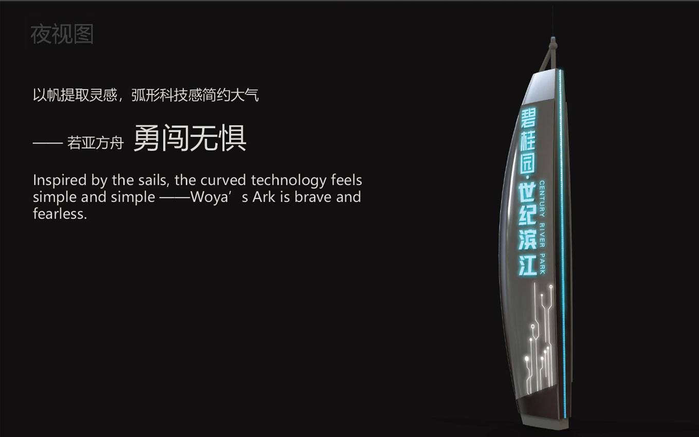 碧桂園·世紀濱江總占地約123畝,總建筑面積35萬㎡,世紀濱江導視牌設計以“濱江生態·花園辦公”概念為藍本,打造灣區創新門戶,佛山首個濱江產融旗艦綜合體。綜合體標識設計范圍涵蓋獨棟總部、濱江寫字樓、創變SOHO、活力街區、江畔美宅5大業態、打打造集“大企業展廳、智能科技體驗中心、智能總裁駕駛艙、科技交流中心、創新科技服務中心、科技孵化加速中心”等功能于一體的企業科技創新會客廳,鑄造佛山科技創新的新名片,推動佛山創新智造產業發展。設計構思以:濱江生態與科技結合,金屬質感樹干造型+圍邊樹葉,指示內容印于樹葉上,簡潔金屬流線型線條,結合濱水靈動+科技硬朗質感。